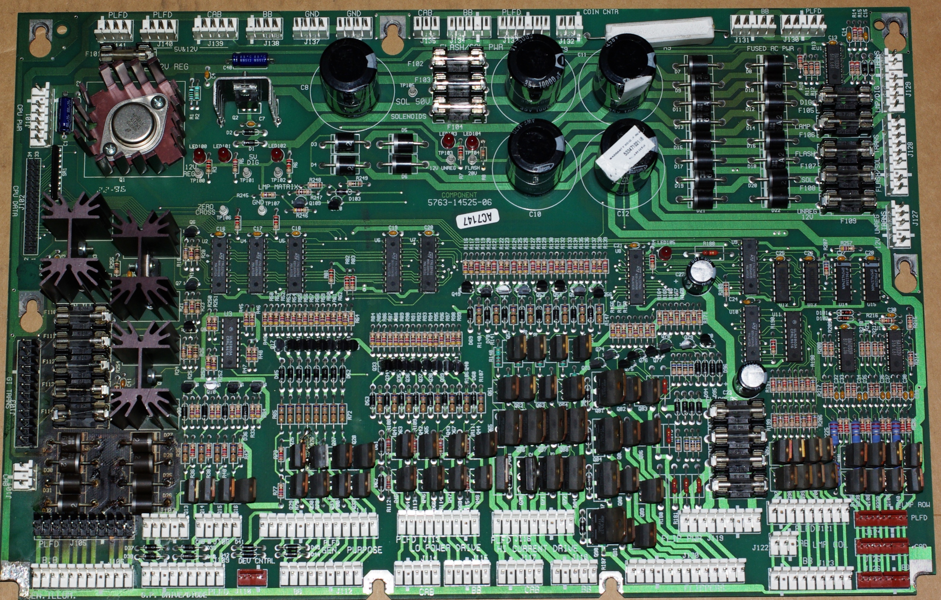 When Williams switched to WPC-95, they dropped from five controlled GI circuits down to three. They replaced two of them with always-on GI, eliminating two heatsinks and triacs from the board. A triac causes a voltage drop, so Willams inserted four diodes in each alwasy-on circuit in a series-parallel arrangement to reduce the GI voltage. Presumably, they did this to extend bulb life. But they didn't figure out that the diodes would make as much heat as the triacs - which have great big heatsinks. So the diodes get hot, and burn up the PCB. It blackens and delaminates. Williams eventually switched out the diodes for zero-ohm resistors. Here, we look at how you can easily remediate a bad board with just two wires.