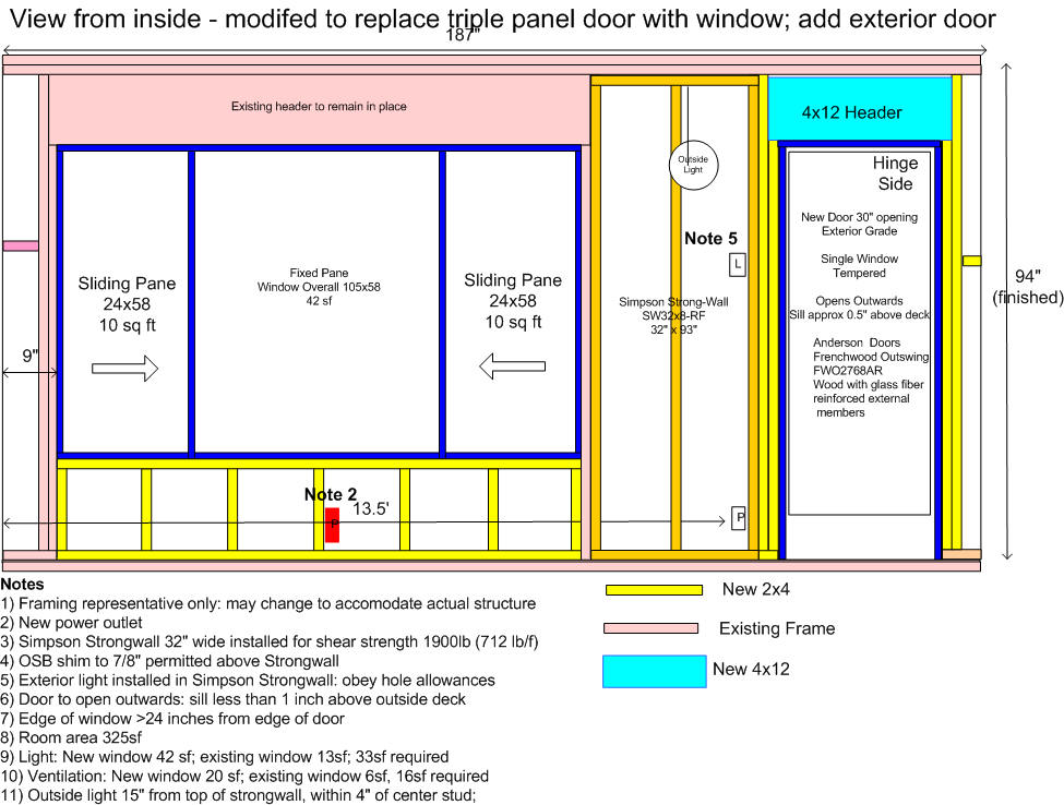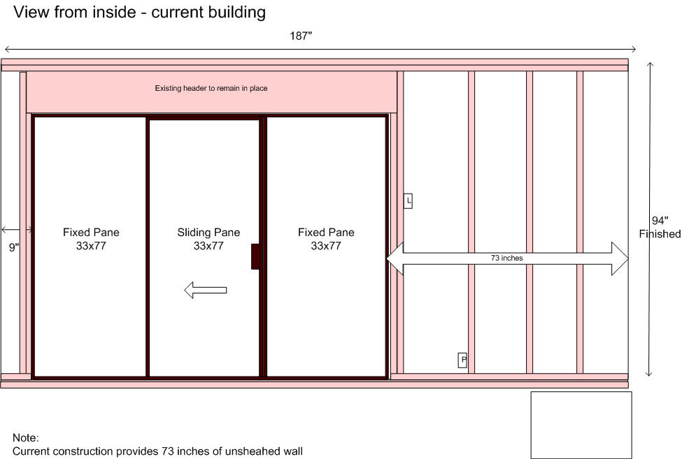 Enter the Simpson Strongwall, a $300 piece of plywood with some bracing and glue. Why so expensive? It meets code. Below is the design we had approved. Note the lack of space in the wall. It is almost all solid wood. There's an air gap at each end. That's it.
